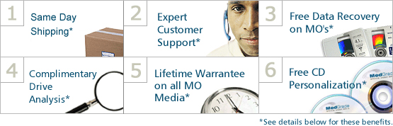 Lifetime Warranty - All Magneto Optical media products purchased from MedGrade carry a lifetime warranty. All of MedGrade's Magneto Optical Disks carry a manufacturer lifetime warranty. If a MO Disk you purchased from MedGrade fails, contact customer service and we will send you a replacement MO Disk. |